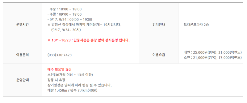 케이블카 요금 안내
