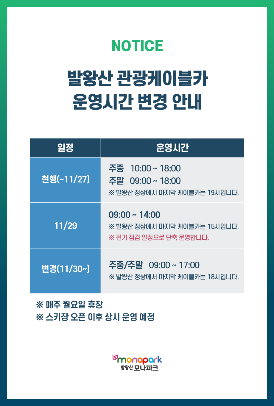 단풍 시즌인 9월 29일부터 11월 2일까지는 상시 운영되니 이 시기에 방문하면 더욱 멋진 경치를 즐길 수 있습니다.