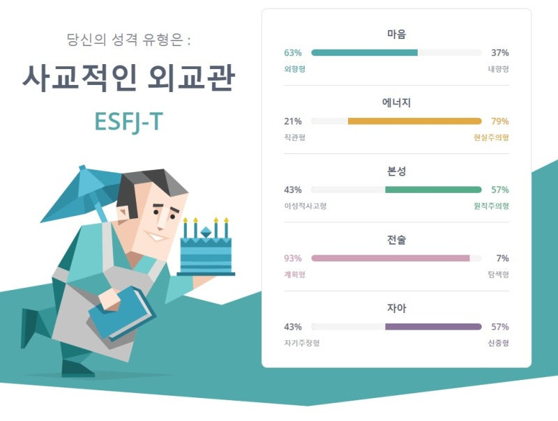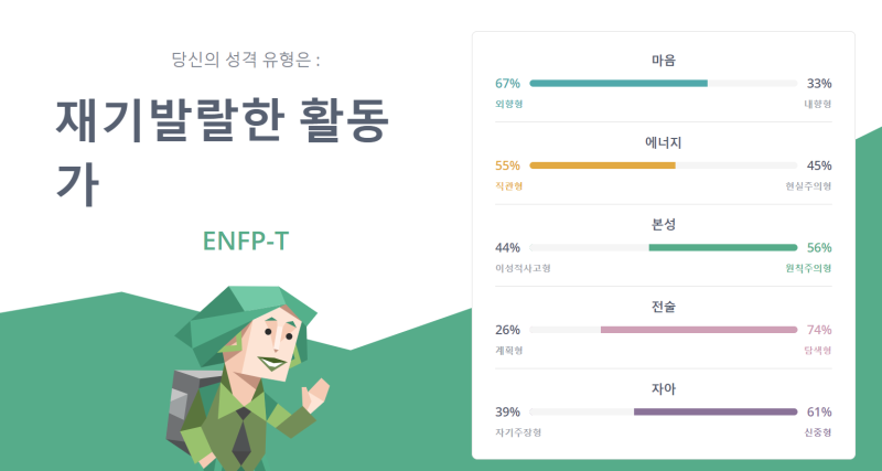 검사 결과는 4개의 지표로 나뉘어 16가지 성격 유형 중 하나로 분류됩니다. 검사 소요 시간은 약 10~15분 정도입니다.