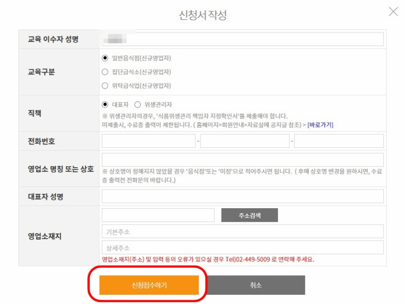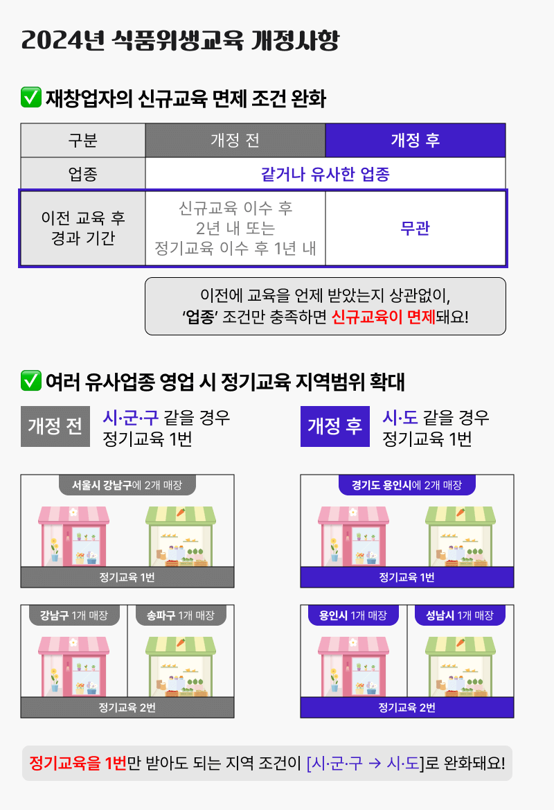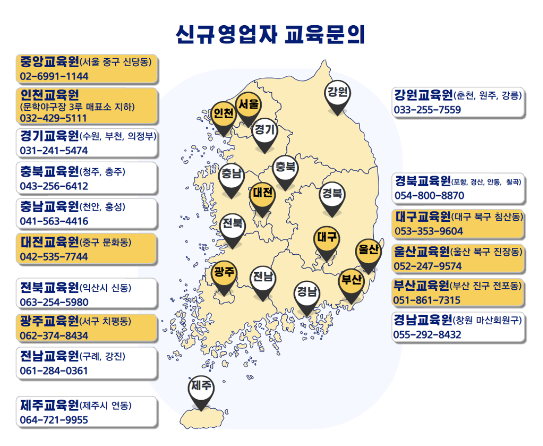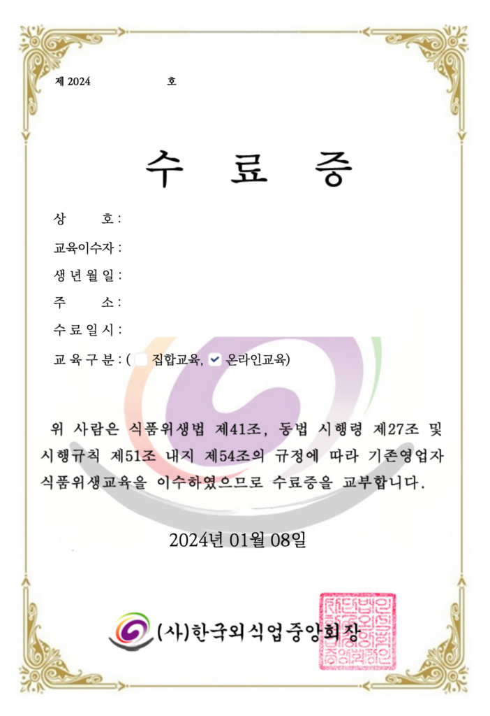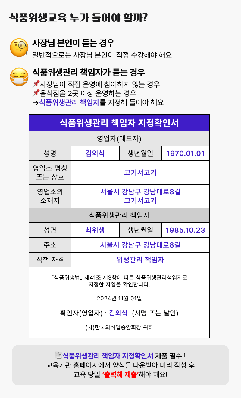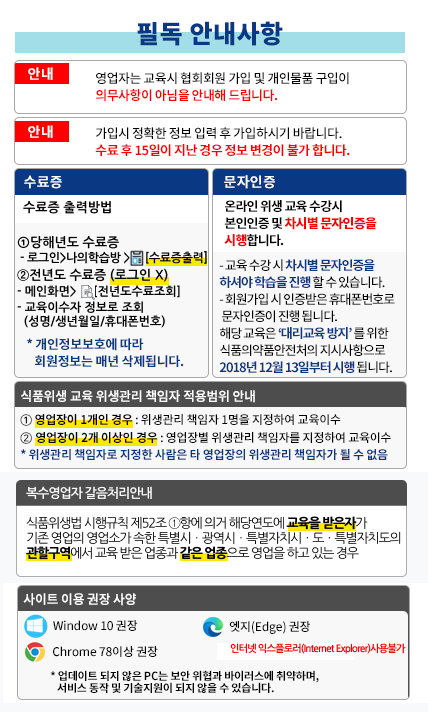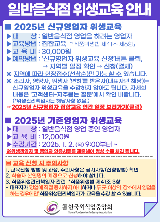 - 신규 영업자 교육 : 신규로 음식점을 운영하고자 하는 분들을 위한 기본적인 식품위생 교육입니다.