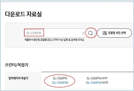 - 프린터 모델명 입력 : 사용 중인 프린터의 모델명을 입력하고 검색합니다.