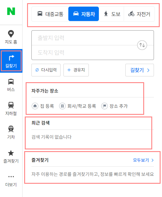 - 출발지와 도착지를 입력한 후, '길찾기' 버튼을 클릭합니다.