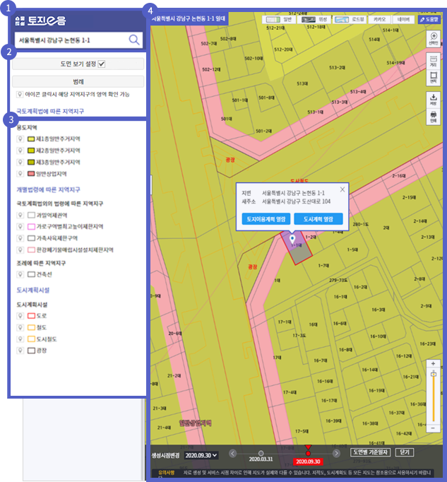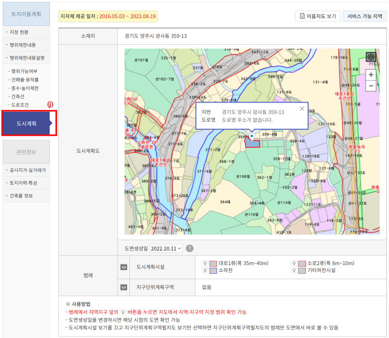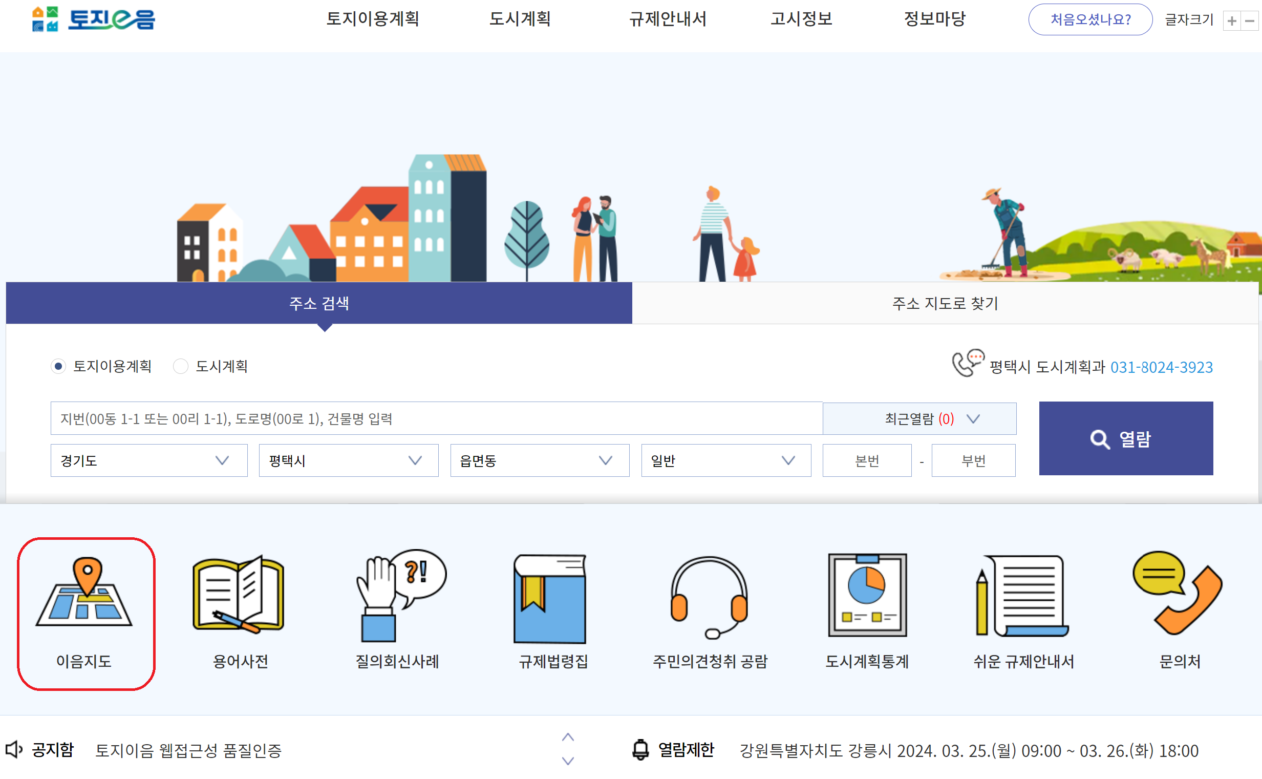 - 이음지도 메뉴에서 원하는 지역의 주소를 입력하면 해당 지역의 토지이용계획을 확인할 수 있습니다.