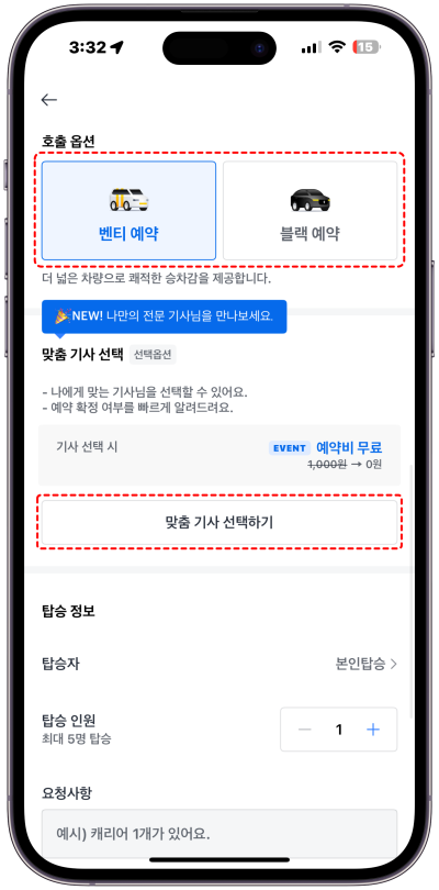 목적지를 입력한 후, 예약할 택시 종류를 선택합니다. 일반 택시, 벤티(대형 택시), 블랙(프리미엄 택시) 등 다양한 옵션